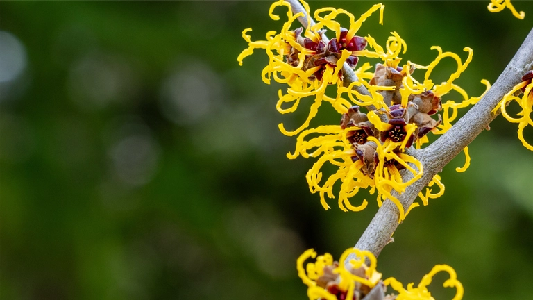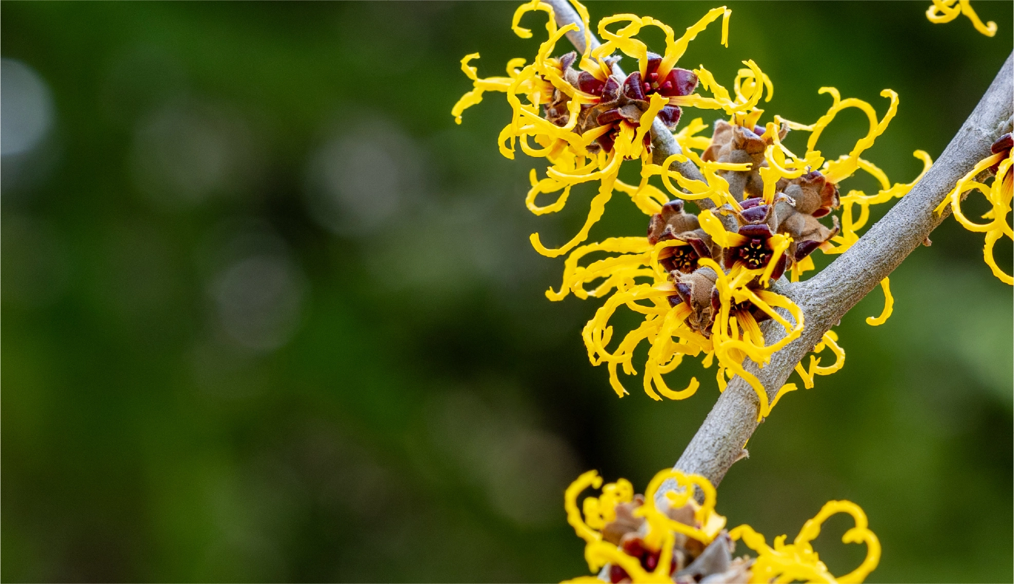 Witch Hazel’s bright yellow, ribbon-like flowers bloom in the late fall, often the only blast of color you’ll see this time of year.